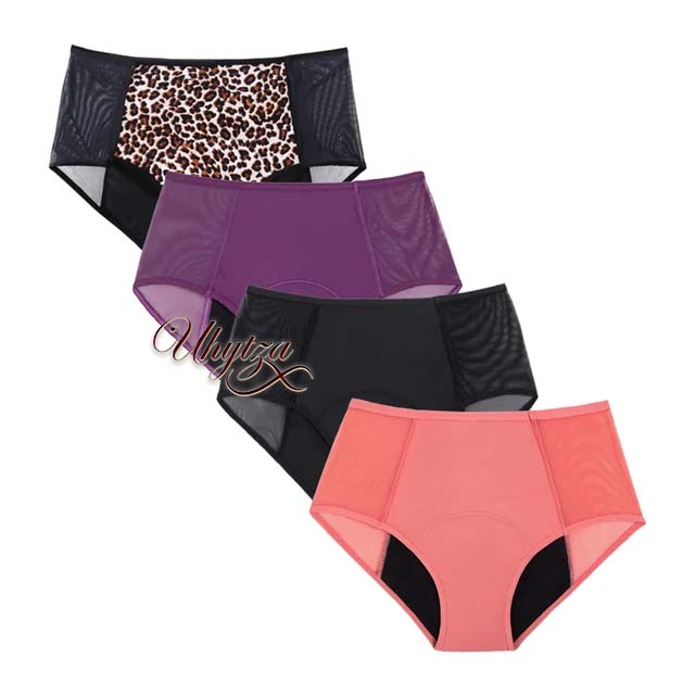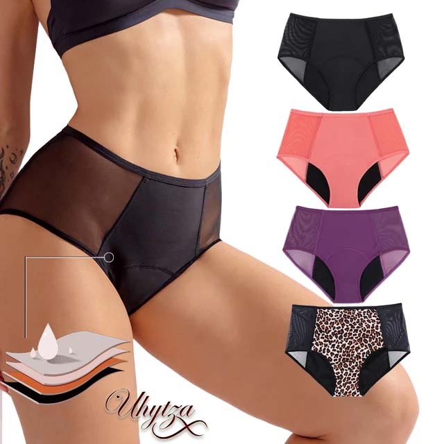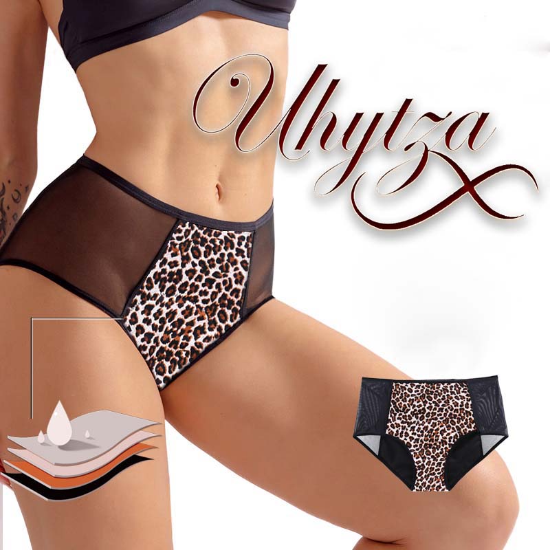 Optez pour Uhytza, la culotte de règles imprimée léopard, lila et rose, durable, efficace, invisible et discrète. Conçue spécialement pour les menstruations, cette culotte ultra absorbante équivaut à 4 tampons, vous offrant une solution pratique et économique pour gérer vos règles en toute sérénité.